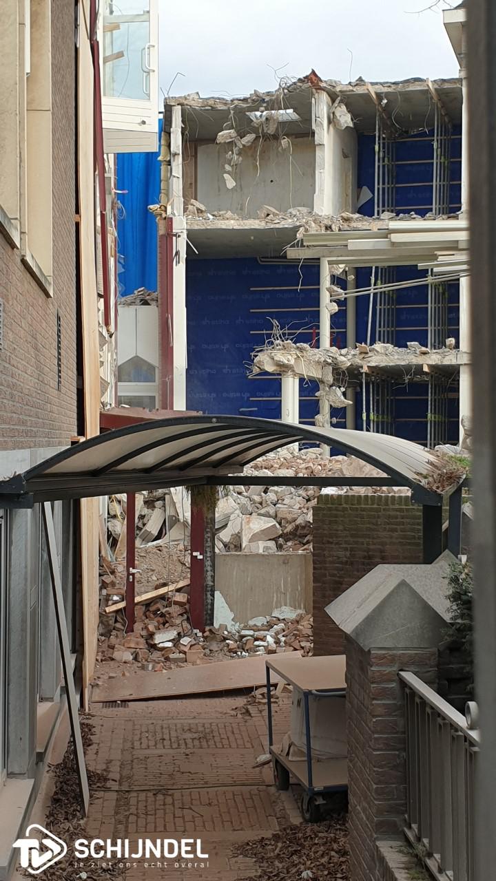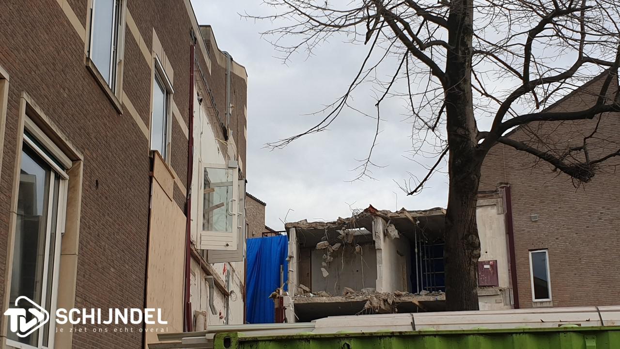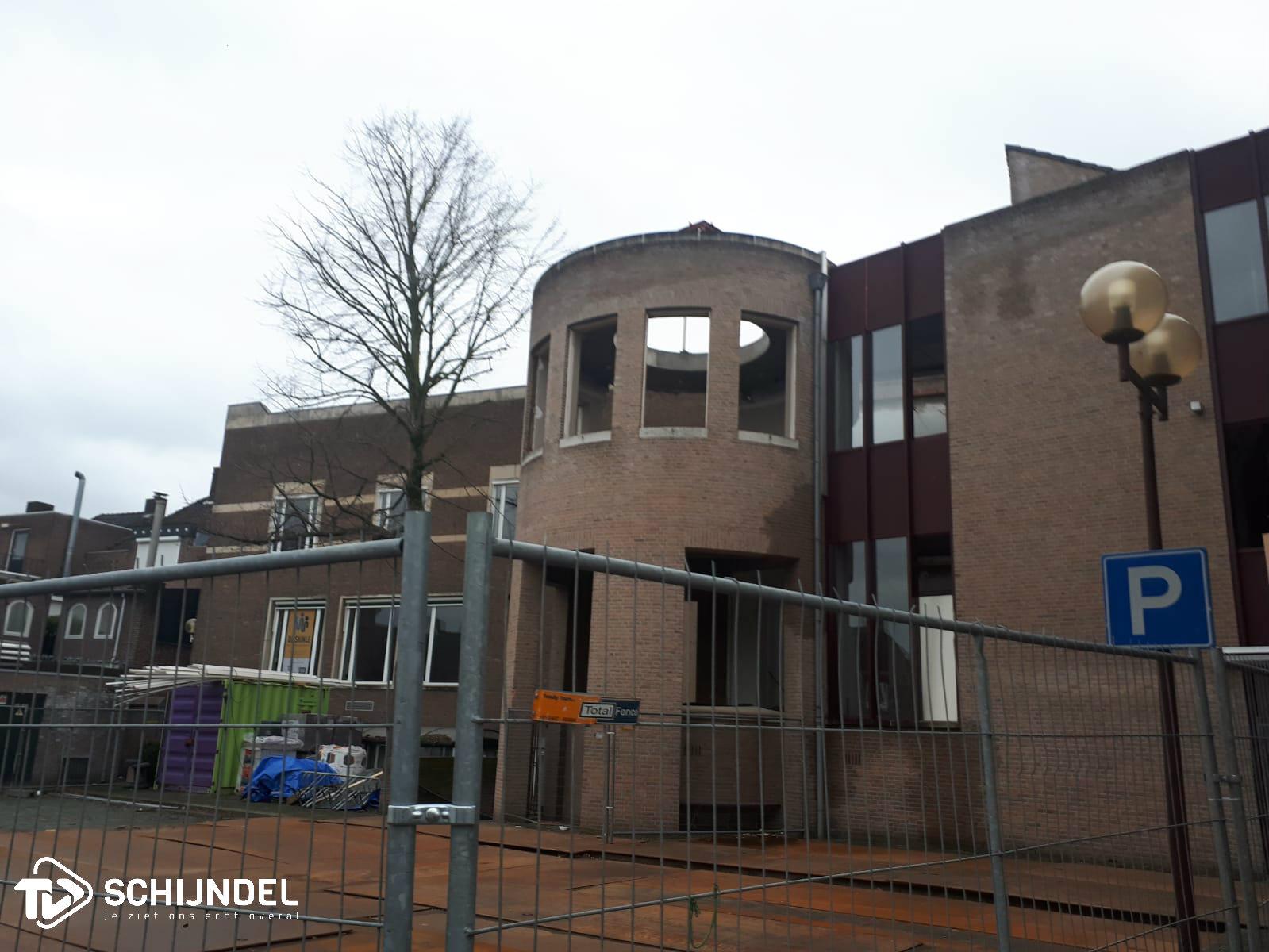 Schijndel - De gedeeltelijke sloop van het voormalig gemeentehuis van de gemeente Schijndel is in volle gang. De splitsing is zo goed als gerealiseerd. Afgelopen weken werden al enkele muren en vele ramen verwijderd. Vorige week werd begonnen met de sloop van de zogenoemde Ronde Kamer aan de achterzijde. Afgelopen dagen zijn de laatste muren die het nieuwe en oude gedeelte aan elkaar verbonden, ook met de sloophamer naar beneden gehaald. Vanaf de voorzijde zijn de woningen aan het Verlengde Kloosterpad nu bijna zichtbaar. Vanaf de achterzijde is het kleine kerktorentje van de Sint Servatiuskerk zichtbaar tussen de nieuw- en oudbouw door. De splitsing was nodig vanwege de nieuwe plannen met het voormalig gemeentehuis. Onder 'lees meer' enkele foto's. |