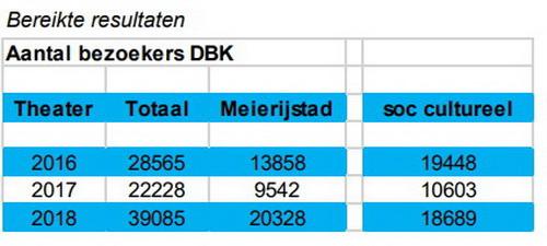 Bereikte resultaten DBK heeft in de eerste plaats een theaterfunctie voor de eigen inwoners en organisaties in Meierijstad. Bijna 50% van het aantal bezoekers komt uit Meierijstad. Daarnaast wordt geconcludeerd, dat DBK ook een regionale functie heeft. Uit negen andere gemeenten dan Meierijstad komen bezoekers naar dit theater. Buiten het verspreidingsgebied van de brochure wordt zelfs 35% bereikt van het totaal aantal bezoekers. Een overzicht daarvan in de afgelopen jaren vindt u helemaal onderaan. DBK programmeert naast professionele theateractiviteiten ook activiteiten die gerelateerd worden aan sociaal-cultureel werk en de amateurkunst. DBK faciliteert derden of organiseert eigen activiteiten in een van de zalen. In 2018 waren dit bijna 19.000 activiteiten. In 2017 was er sprake van een daling van bezoekers en activiteiten vanwege een 'gebroken' theaterseizoen als gevolg van de sluiting van het theater aan het Stadhuisplein en de verhuizing naar de Noordkade.