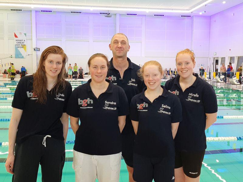 Foto: Neptunus '58 Op de foto achter Rob van de Ven, voor van links naar rechts Linda Schellekens, Sandra Schellekens, Selina Janssen en Mirelle de Kort.