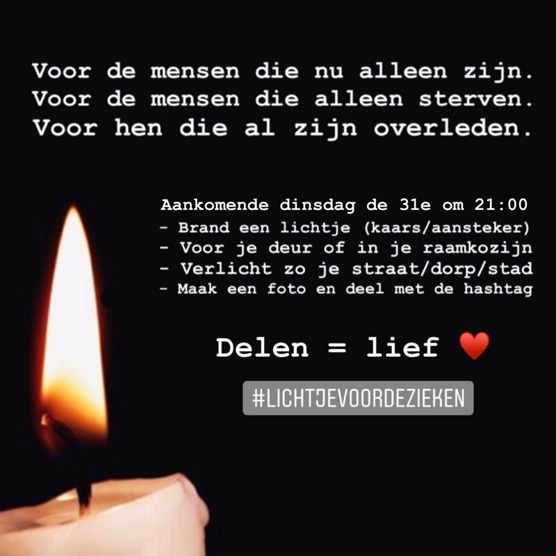 Carin van Oekel 28 maart om 06:40 Lieve mensen, willen jullie mij helpen met het initiatief #lichtjevoordezieken In de instellingen en ziekenhuizen mogen patiënten geen bezoek meer ontvangen. Niet wanneer je ziek bent. Zelfs niet wanneer je sterft. Deze maatregel is nodig en begrijpelijk, maar niet minder pijnlijk. Want juist in deze onzekere tijd is liefde van je naasten zo waardevol. Vorige week was er een ontzettend bijzonder applaus voor mensen in de zorg. Het lijkt mij mooi om iets te doen voor de mensen die deze zorg nodig hebben. Diegenen die nu ziek en alleen zijn. Ook zal het voor alle mensen die nu op afstand moeten blijven van hun geliefden, een troost kunnen zijn. In deze vooral bizarre tijd. Daarom deze actie #lichtjevoorzieken |