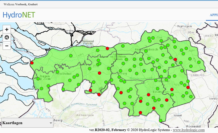 In Noord-Brabant meten 112 peilbuizen (kaart per 1 april 2020) constant de grondwaterstand. Als de gemeten grondwaterstand op 1 april lager is dan de vastgestelde ondergrens, kleurt het punt rood. Als meer dan de helft van het aantal meetpunten in een beregeningsdeelgebied rood kleurt, kan het waterschap op 1 april een verbod instellen voor het beregenen van grasland uit grondwater.