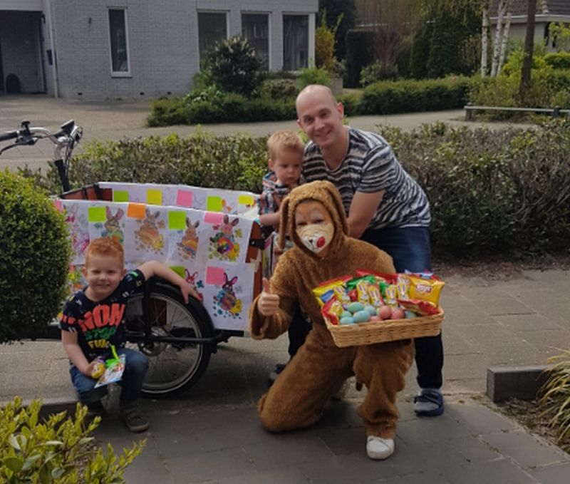 Schijndel - Het jaarlijkse paaseieren rapen kon helaas niet doorgaan vanwege de COVID-19. De Paashaas kon de kinderen niet missen, en had daarom een alternatief gevonden. Alle kinderen die zijn kleurplaat hadden gekleurd en ingeleverd, kregen een meet-and-greet aan huis met de Paashaas. Met een veilig mondkapje op kon hij de kinderen toch iets lekkers gaan brengen om hen te bedanken voor de fantastische kleurplaten die hij had ontvangen. Er waren ook kinderen buiten Wijk Plein waarvan de Paashaas een kleurplaat had ontvangen dus ook die werden verrast met zijn bezoekje. Met zijn fietskar heeft hij heel Schijndel doorkruist. Je kon de Paashaas al van verre aan horen komen, want er was ook muziek. Alle kleurplaten waren zichtbaar. Als de kinderen het leuk vonden konden ze hun eigen kleurplaat nog even zoeken op de fietskar. De Paashaas is erg dankbaar dat hij overal met open armen werd ontvangen. Hij is zelfs een keer uitgenodigd voor Tweede Paasdag, geweldig. Ondanks dat het paaseieren rapen niet kon doorgaan is het toch nog echt een paasfeest geworden.