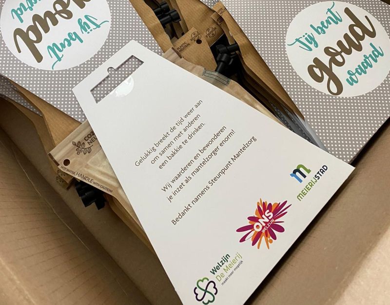 Meierijstad - Mantelzorgers zijn altijd onmisbaar. En in deze tijden van corona zijn ze vaak nog meer bezig metde zorg voor hun naaste. De gemeente Meierijstad heeft daarom deze week samen met het mantelzorgsteunpunt van Welzijn De Meierij en ONS Welzijn zo’n 2.000 geregistreerde mantelzorgers een cadeautje bezorgd. Ruim 70 vrijwilligers van Welzijn De Meierij en ONS welzijn zijn maandag 8 juni op stap geweest om mantelzorgers in Veghel, Sint-Oedenrode en Schijndel te verrassen met een originele wenskaart met de tekst “Jij bent goud waard” en heerlijke fairtrade koffie. Gemeente Meierijstad wil op deze manier de mantelzorgers een hart onder de riem steken.