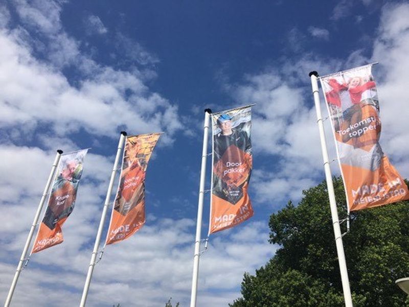 Meierijstad - Meierijstad kleurt oranje; Nieuwe banieren sieren voortaan de belangrijke invalswegen van de drie grootste kernen in Meierijstad. Het zijn permanente uitingen van ‘Made in Meierijstad’. Dat is de eerder gestarte campagne waarin Meierijstad zichzelf op de kaart zet op onder meer de thema’s food, cultuur en ondernemerschap. Vandaag werd het eerste exemplaar geplaatst aan de Corridor in Veghel. In totaal worden er 52 banieren geplaatst; 7 meter hoge vlaggenmasten in sets van 4 aan weerszijde van belangrijke in-en uitgangswegen. De locaties zijn strategisch gekozen in het zicht van de vele passanten.