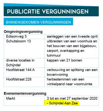 Schijndel - De organisatie van Schijndel aan Zee heeft een evenementenvergunning aangevraagd voor een editie eind 2020 op de Markt. De data bij de gemeentelijke publicaties staat op 3 tot en met 27 september. Dat betekent dat het een verlate editie zal worden, eigenlijk zou Schijndel aan Zee na de kermis plaatsvinden, in juli en augustus. Of de verlate 2020 editie doorgaat is nog niet bekend. De vergunning is alleen nog maar aangevraagd en nog niet verleend. Binnen een paar weken moet daar duidelijkheid over zijn. Op 19 juni plaatste de organisatie al een bericht op de Facebookpagina waarin een latere en/of andere vorm werd aangekondigd.| |