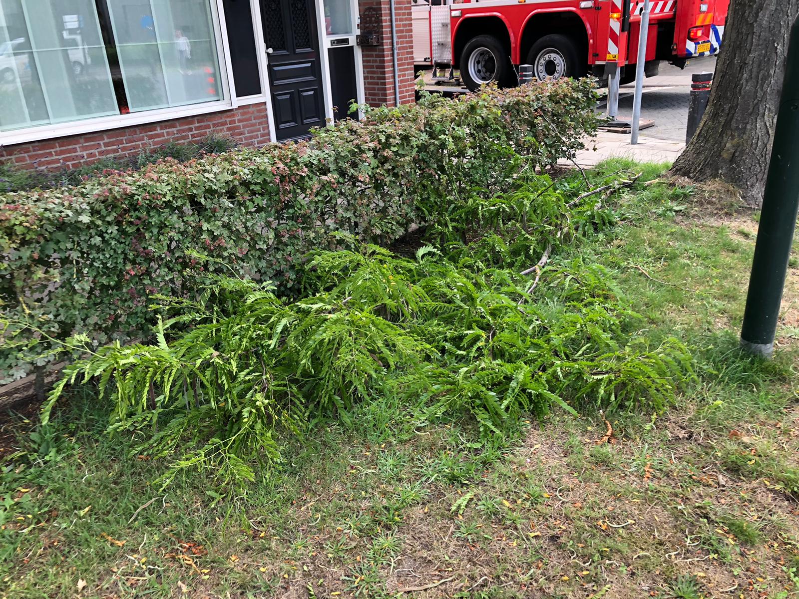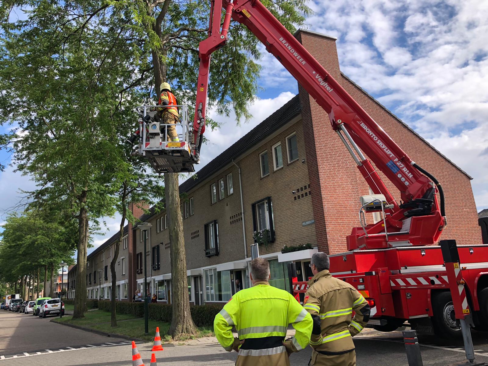 Schijndel - De brandweer van Veghel werd maandagavond opgeroepen naar de Deken Baekersstraat. Daar bleek een tak gevaarlijk los te hangen aan een boom boven het voetpad. Een vrouw had de tak los zien hangen en was naar de brandweerkazerne gelopen met de vraag wat er mee moest gebeuren. Een brandweerman was toevallig aan het werk (normaal is de post onbemand) en liep mee. Omdat een normale brandweerwagen oproepen geen zin had is de hoogwerker van Veghel opgeroepen. Deze was snel ter plaatse en de brandweerlieden hadden de tak ook snel los. Na ongeveer twintig minuten was de situatie weer veilig. Foto's: Christian vd Broek