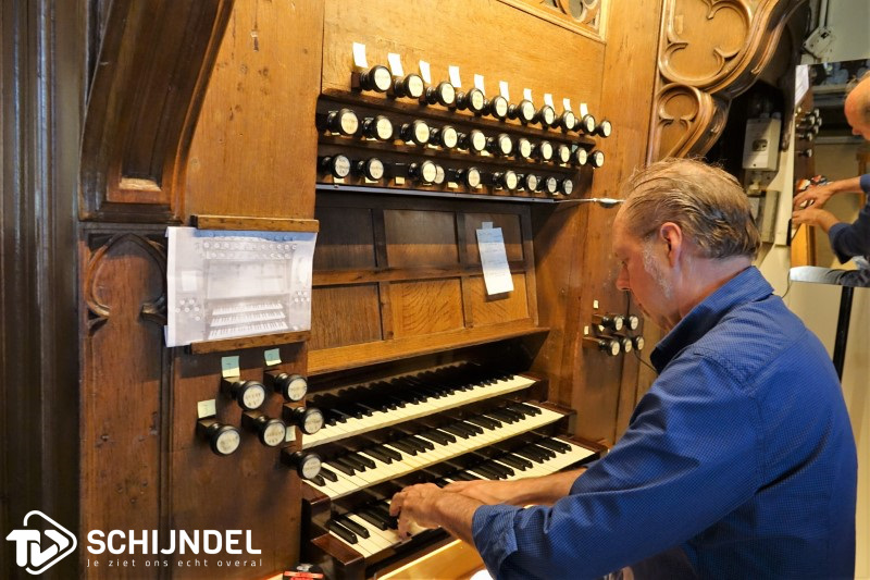 Schijndel - Het was een bijzonder concert, gisteravond in de Servatiuskerk, waar organist Bart van Dongen, acte de prescence gaf. Bart, geboren in het plaatsje Zeeland woont al jaren in 's-Hertogenbosch en bewandeld zijn hele leven al het muzikale pad. Het bijzondere van dit concert was dat hij deze avond twee orgels bespeelde, zowel het kleine orgel beneden als boven op het grote Smits orgel. Wat hij met zijn muziek doet is eigenlijk de orgels gebruiken als een soort synthesizer. Eerst bespeelde Bart het orgel beneden in de kerk. Daarbij zet hij het onderste klavier en de baspedalen vast met stukjes papier en gewicht van kerkboeken. Door deze toetsen vast te zetten had hij zijn handen vrij om op het bovenklavier te spelen. Na een aantal klanken te hebben opgebouwd en te hebben vastgezet ging hij naar boven om daar het zelfde te doen. Door middel van een camera en een beamer konden de luisteraars beneden in de kerk het allemaal prima volgen. Bekijk ook onze videobeelden. Meer foto's kunt u zien in ons fotoboek.