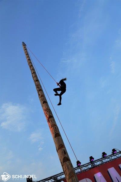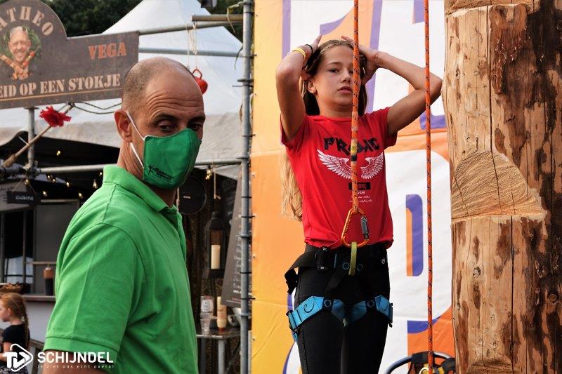 Wijbosch- De organisatie heeft een tijdje een slag om de arm moeten houden, maar uiteindelijk is het toch gelukt om met passende coronamaatregelen het WK paalklimmen door te laten gaan. Met veel vrijwilligers op de been om de entree, bar, EHBO en andere posten te bemannen, en om erop toen te zien dat er voldoende afstand onder de bezoekers werd gehouden. Maximaal 250 toeschouwers op het terrein en handen desinfecteren bij binnenkomst en bij de bar. Van bezoekers werd gevraagd om met maximaal 4 personen bij een tafeltje te staan. Waar eerst de lijst van deelnemers tussen 8 en 15 jaar nog vrij kort was, meldden nieuwe deelnemers zich zodra de eerste klimmers de top bereikt hadden. In het fotoboek vindt u alle foto's. Kyra mocht samen met Mirk het spits afbijten. Voor de 12-jarige Kyra de tweede keer dat ze meedeed. ‘Het blijft spannend ook al heb ik dit vorig jaar ook al gedaan.’ Nadat de eerste klimmers in de ruim 13 meter hoge paal de bel hadden geluid, meldde de 14-jarige Bas zich bij de organisatie voor een inschrijfformulier. ‘Ik wilde eerst niet, want het ziet er best moeilijk uit en je wilt niet voor schut staan. Maar ik heb me toch over laten halen.’ Bas kreeg dan ook assistentie bij het inschrijven om erop toe te zien dat hij zich niet meer bedacht. Andere kinderen benoemden dat het er ook wel eng uit zag. ‘De kinderen zitten gezekerd en hebben een klimtuig aan, dus de klim is veilig,’ vertelde de organisatie. De klimtijden varieerden van 19 seconden tot bijna 3 minuten en er waren daarbij ook verschillende tactieken te zien. De een deed bijna alles op spierkracht van de armen, de ander liet de benen het werk doen. De pauzes van de wedstrijd paalklimmen werden door optredens van verschillende bands ingevuld. Van de meiden was Eline Klein met een tijd van 19.93 seconden de snelste. Op de tweede plaats Eva Donkers met 20.72 seconden en op de derde plaats Sanne van de Wijdeven met 20.94 seconden. Bij de jongens won Björn Groenendaal met 25.78 seconden. Op de tweede plaats eindigde Michon Scheutjens met 30.28 seconden en op de derde plaats Jordy v.d. Heuvel met 33.15 seconden.