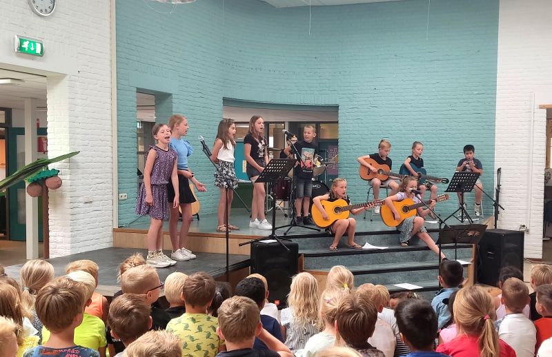 Schijndel - De EBC Noord schoolband trad vrijdag 15 juli voor het eerst op. Bij EBC Noord is een heuse schoolband opgericht sinds september door hun muzikale juf Floor van Uittert. Leerlingen van ‘t Kwekkeveld en de Vossenberg mogen zich aansluiten bij de band. Elke vrijdagmiddag repeteren ze op school. Vrijdag 15 juli mochten ze optreden voor publiek. Het was een gezellige middag met muzikale noten o.a. van Suzan & Freek en Flemming met het lied 'Kijk de zon die danst op de ramen'. Er werd enthousiast gezongen en gespeeld en het publiek (leerlingen van EBC Noord) klapte gezellig mee.
