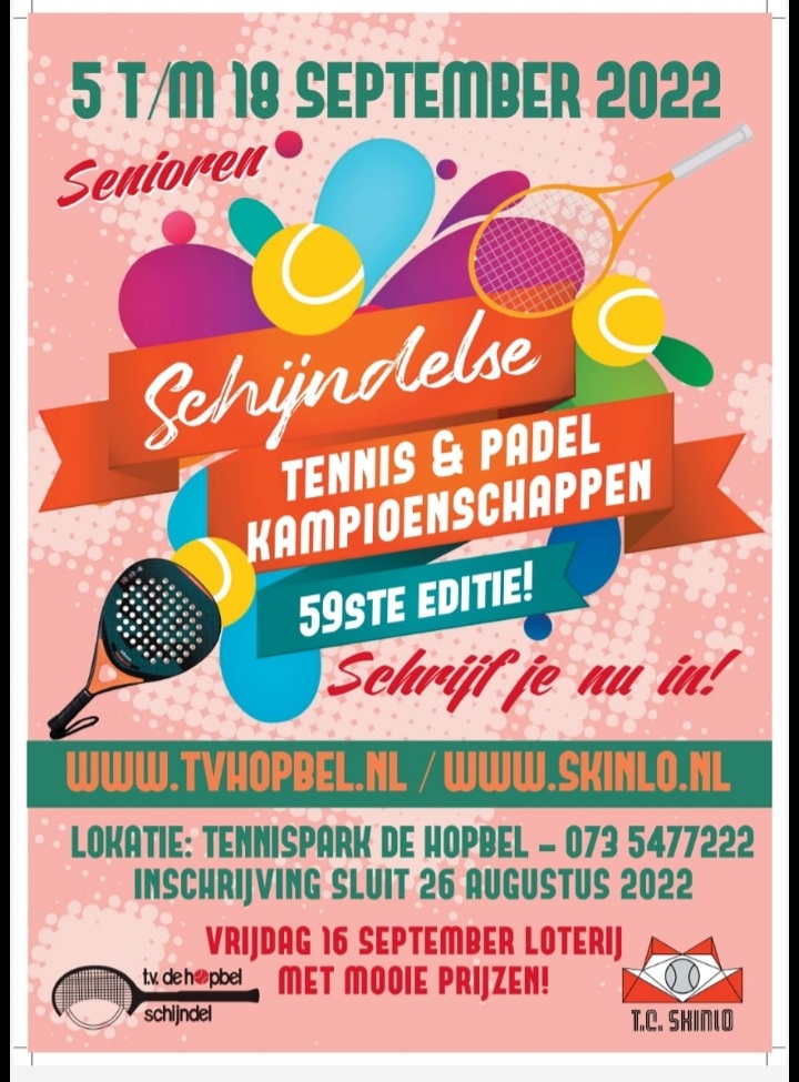De Schijndelse Kampioenschappen worden gehouden van 5 t/m 18 september bij Tennis en Padel Vereniging de Hopbel. Alle informatie vindt je op www.tvhopbel.nl en www.skinlo.nl. De inschrijving sluit op 26 augustus.