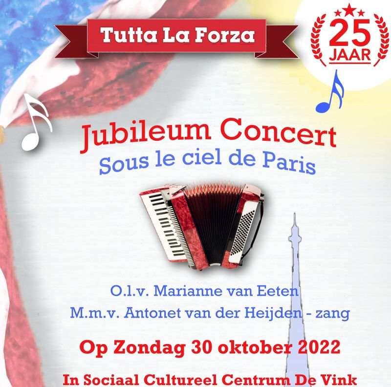 Schijndel - Accordeonvereniging Tutta La Forza bestaat 25 jaar. Het is een actieve vereniging met leden uit Schijndel en de wijde omgeving. De vereniging heeft twee orkesten, Prima en Secunda, die zowel apart als samen spelen. Het 25-jarig jubileum willen ze graag met u vieren tijdens een speciaal jubileumconcert op zondag 30 oktober om 14.00 uur in S.C.C. De Vink (Hoevenbraaksestraat 28 in Schijndel). Met een accordeon kan zoveel verschillende muziek gemaakt worden dat ze u dit graag in dit concert laten horen.
