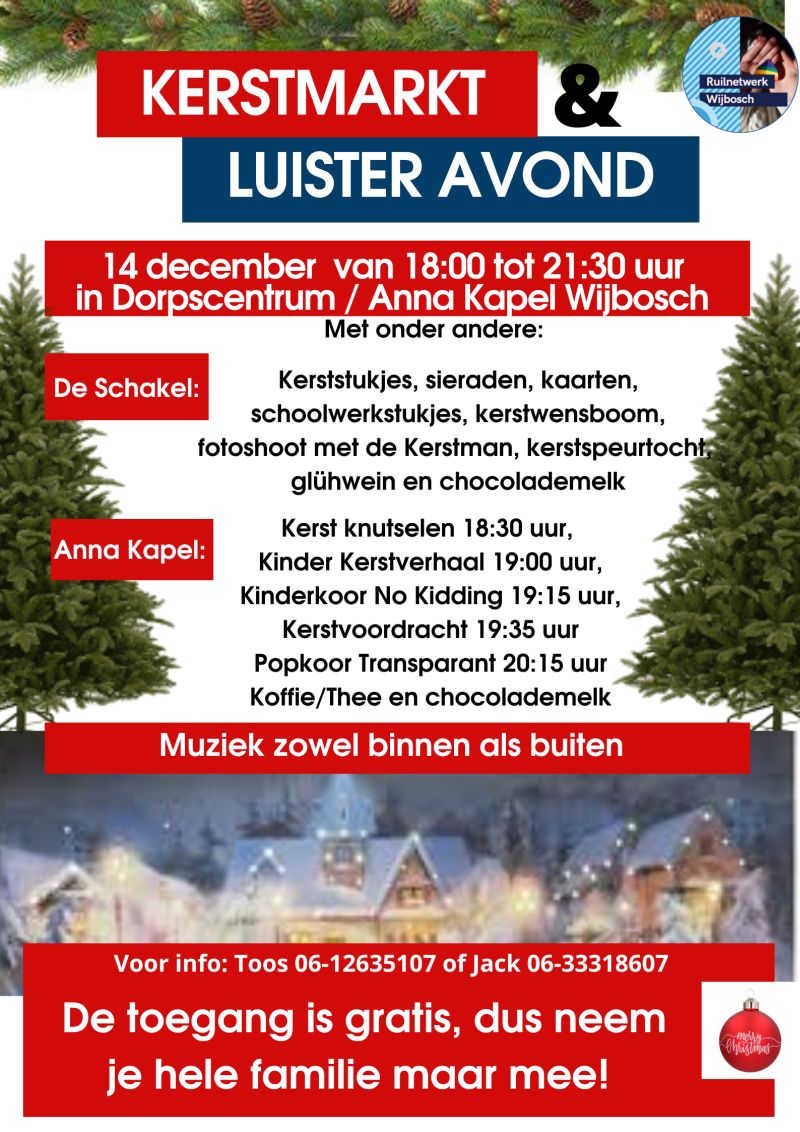 Met een glaasje glühwein en/of chocolademelk en met een appelflap, dommel je jezelf heerlijk onder in de kerstsfeer met de liederen in de Anna Kapel van het kinderkoor NO Kidding (19:10) en Popkoor Transparant (vanaf 20:15). Deze speciale editie van de Luisteravond begint met een knutseltafel (18:30 uur) en heeft een kinder Kerstverhaal (19:00 uur) en ook een kerstvoordracht. Een bijzonder interessante avond, waarbij de toegang GRATIS is, dus neem je hele familie maar mee.