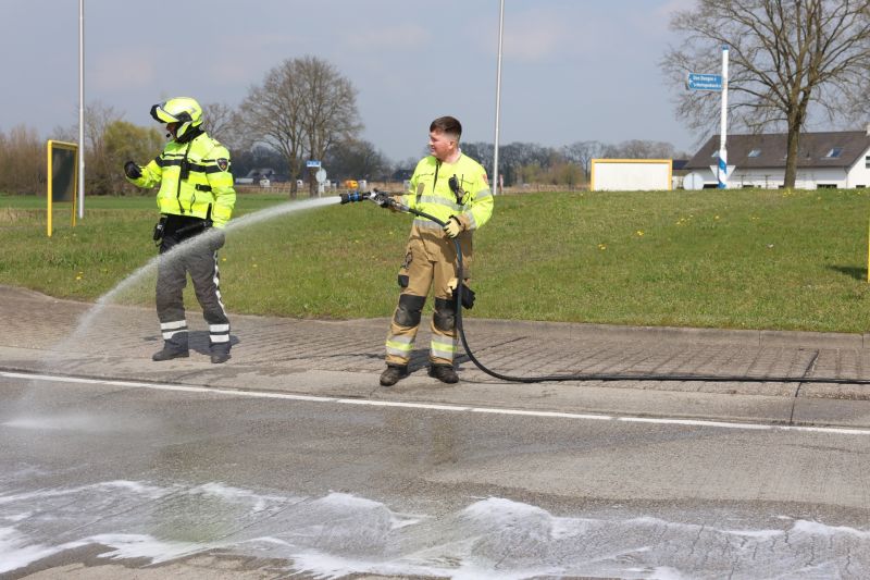 Sint Michielsgestel - Zondagmiddag, eerste paasdag, werd de brandweer gealarmeerd om het vervuilde wegdek van de N617 tussen Sint-Michielsgestel en Schijndel te reinigen. Op de rotonde bij Sint-Michielsgestel was zelf een motorrijder onderuit gegaan op de gladde rijbaan. |