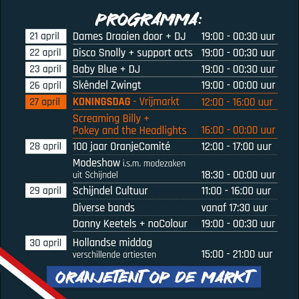 Schijndel - Vrijdag start de Oranjeweek in de tent op de markt in Schijndel. Met super live entertainment voor jong & oud! Het programma zit de hele week boordevol.