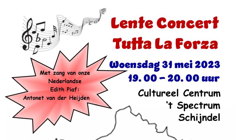 Het concert zal in het teken staan van Franse muziek. Onder de enthousiaste leiding van dirigente Marianne van Eeten zal het accordeonorkest gevarieerde Franse muziek spelen. U hoort bijvoorbeeld Cent mille Chansons, Le Printemps en Mon Dieu. Antonet van der Heijden, 'onze Nederlandse Edith Piaf', zal onder begeleiding van Tutta La Forza o.a. de mooie nummers Sous le Ciel de Paris, Padam Padam en Non, Je ne regrette rien zingen.