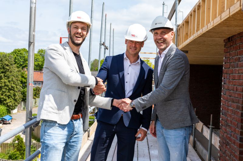 Schijndel - Een feestelijk moment vandaag aan de Gasthuisstraat in Schijndel. Woonmeij en To Build vierden samen met toekomstige bewoners, vaklieden en genodigden het hoogste punt van de bouw van 15 sociale huurwoningen.