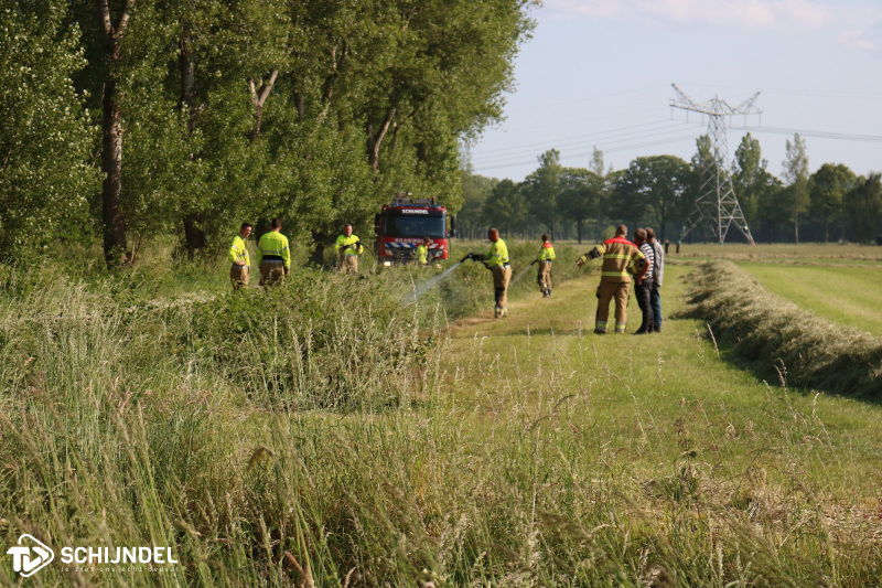 Rond zes uur werd de waterwagen van de brandweer opgeroepen om de berm nog natter te maken zodat het vuur niet opnieuw op kon laaien. Hoe het vuur is ontstaan is onbekend. De rook trok aardig wat kijkers richting het weiland.