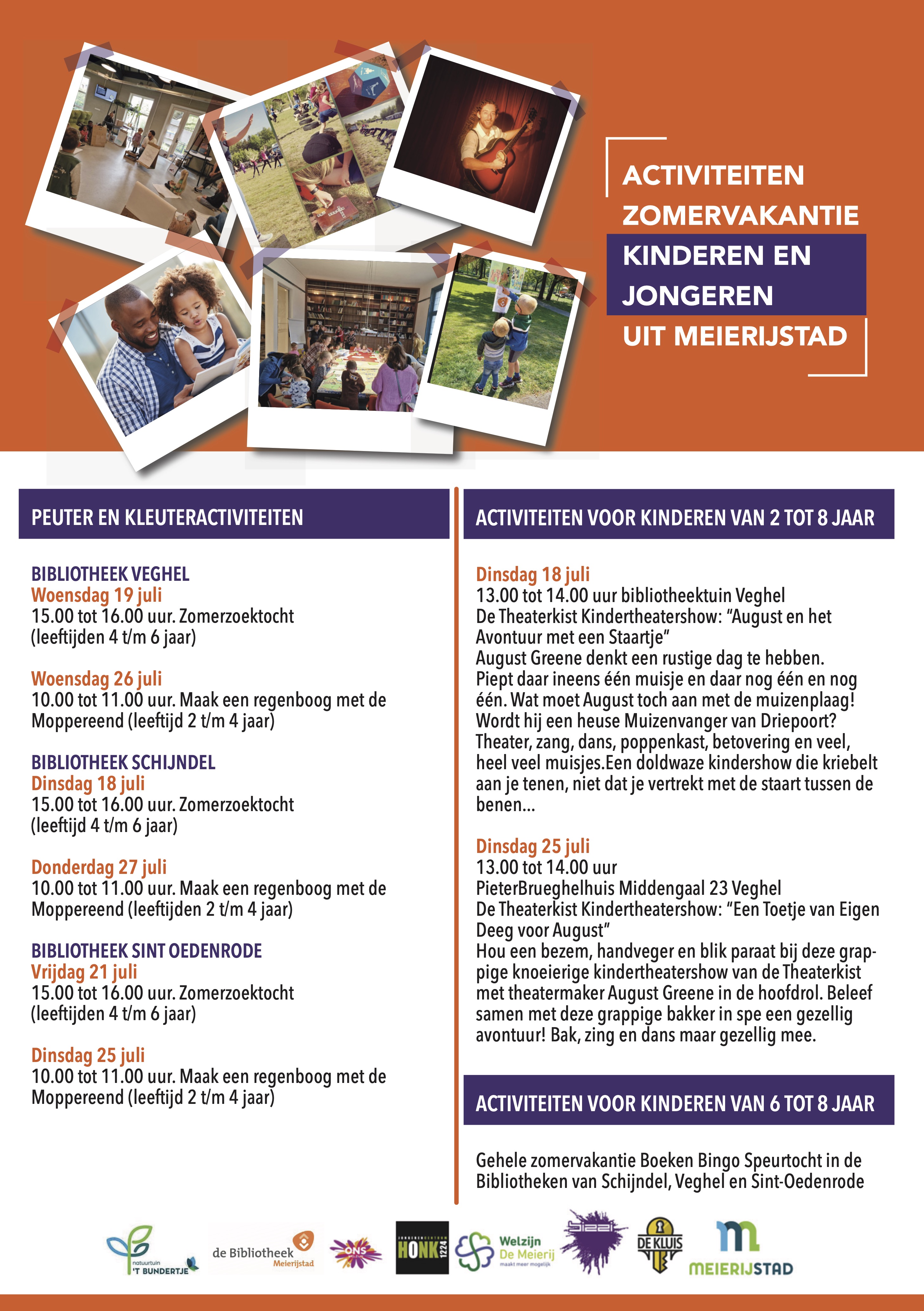 Kinderen en jongeren van 2 t/m 15 jaar kunnen hieraan gratis deelnemen (met uitzondering van watervoetbal). Een greep uit het programma voor kinderen van 2 t/m 8 jaar: • Boeken Bingo Speurtocht (gehele zomervakantie) • Zomerzoektocht • Maak een regenboog met de Moppereend • De Theaterkist Kindertheatershow: “August en het Avontuur met een Staartje” • De Theaterkist Kindertheatershow: “Een Toetje van Eigen Deeg voor August” • Knutselactiviteit: Linnen tasjes bedrukken en beschilderen • Natuurmiddag voor kinderen (iedere woensdagmiddag)
