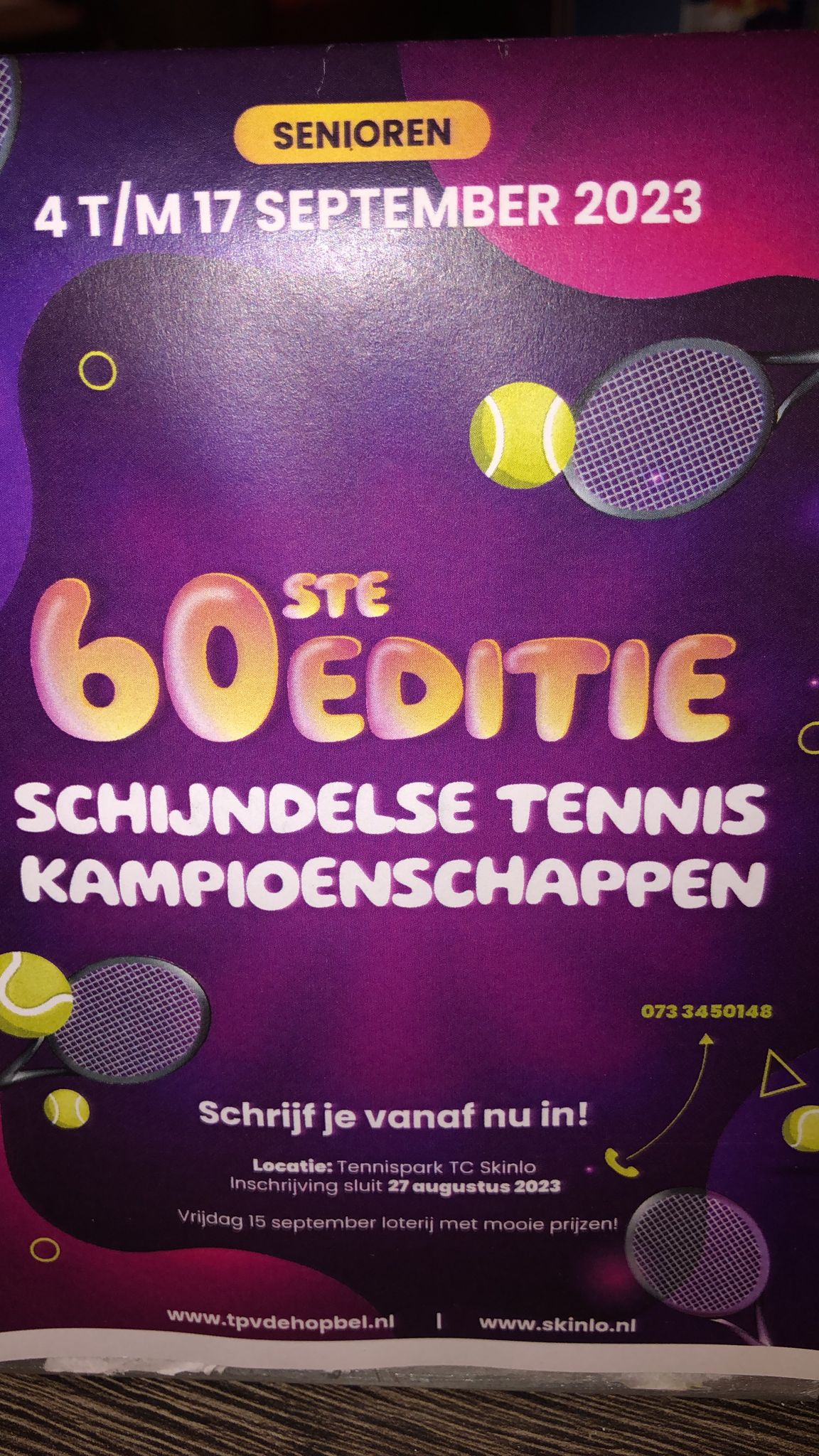 Dit jaar worden de Schijndelse Tenniskampioenschappen van 4 t/m 17 september gehouden bij T.C.Skinlo. Iedereen die lid is van TPV De Hopbel, T.C. Skinlo of in Schijndel woont mag meedoen. De inschrijving sluit 27 augustus. Je kunt inschrijven via deze link.