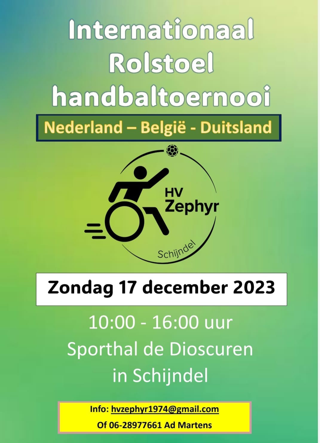 Als tegenprestatie krijgt iedereen die op 17 december 2023 naar het internationale toernooi komt van handbalvereniging Zephyr, dat gehouden wordt in de sporthal Dioscuren te Schijndel (aanvang: 10.00 uur)koffie met gebak., tijdens een gezellig onderhoud met de leden van de rolstoelgroep.