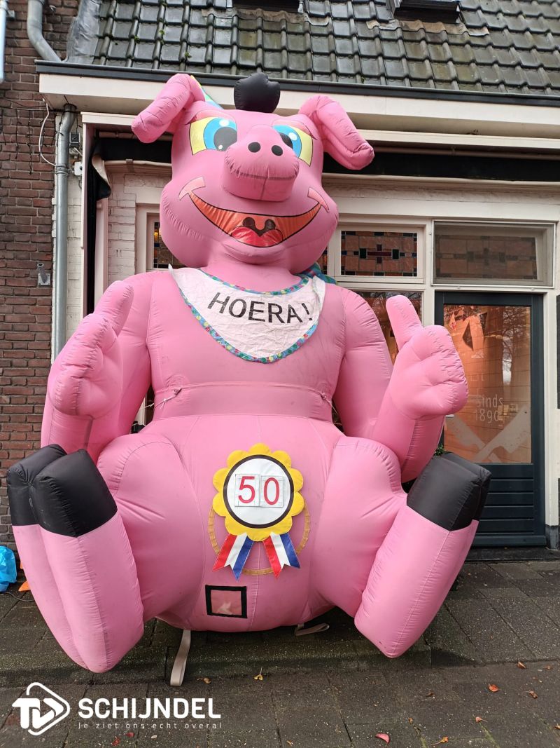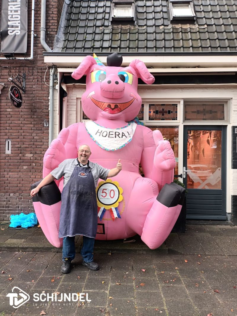 Schijndel - Vandaag is het feest aan het Plein 1944, dat is niet te missen. Dennis van de Ven wordt vandaag 50 en helemaal in stijl staat er een groot roze opblaasvarken voor de zaak.