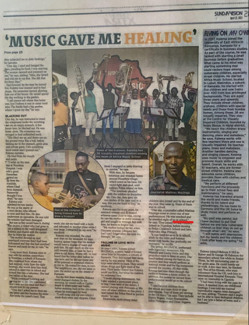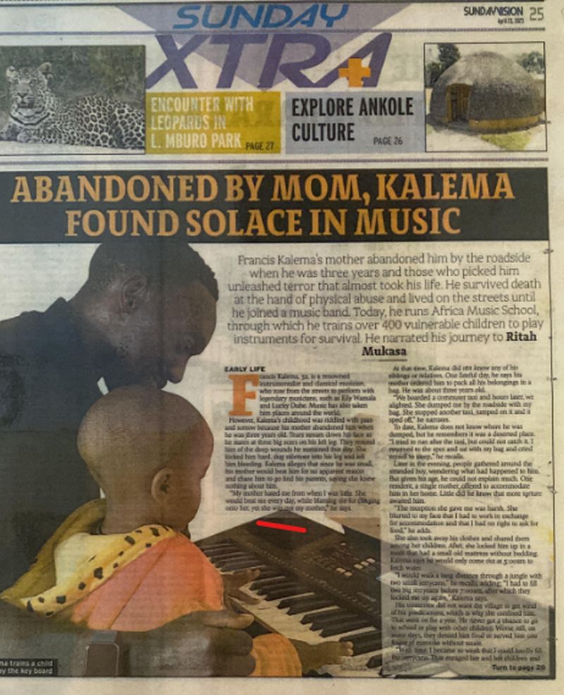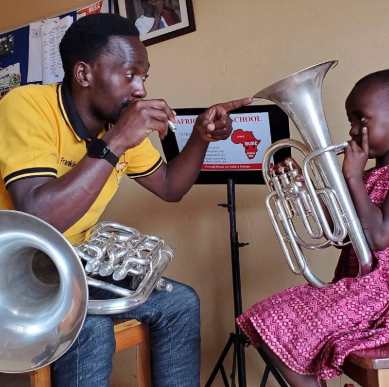 Het gaat over Frank, de oprichter van een muziekschool in Kampala, de hoofdstad van Oeganda. Hij had een heftige jeugd, hij werd als 3 jarig jongetje langs de kant van de weg achtergelaten. Hij woonde op straat tot hij zich bij een muziekband aansloot (zie de bijgevoegde krantenartikelen voor zijn levensverhaal) en werd uiteindelijk gered door muziek. Hij is daar zo dankbaar voor dat hij nu zelf kwetsbare kinderen helpt in zijn muziekschool, the Africa Music School. Menthe wil de toekomst van de muziekschool veiligstellen, maar heeft daarvoor hulp nodig. Daarvoor is ze een crowdfunding actie gestart: https://gofund.me/4cd1f6f4 en ook vraagt ze of mensen instrumenten die ze zelf niet meer gebruiken willen doneren.