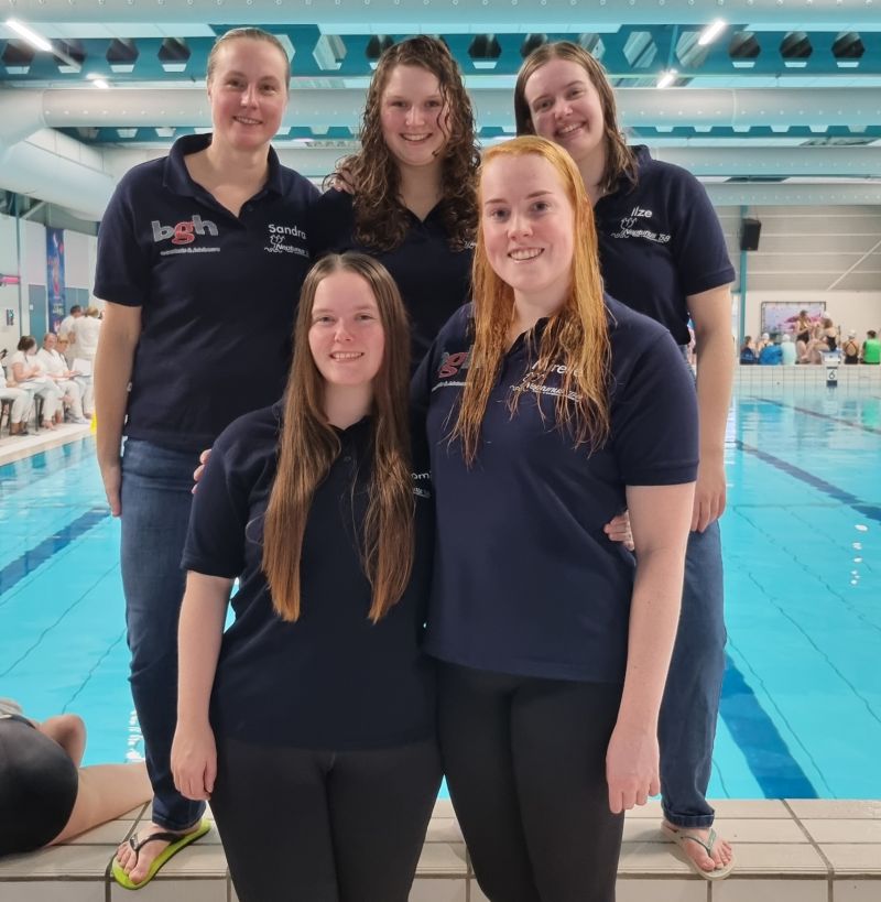Eveline van den Heuvel zwom op het Juniorniveau naar een mooie score van 47,8 punten. Dat was maar liefst 3,4 punt hoger dan bij de vorige wedstrijd. Ook nam ze het clubrecord op de thrust spin down 360 over van Ilze van Kuilenburg. Ilze zette deze wedstrijd 48,3 punten op het scorebord, net iets minder dan bij haar vorige wedstrijd. Sandra Schellekens en Naomi Bottenheft zwommen ook op Juniorniveau. Ze hadden de figuren uit deze wedstrijd nog niet eerder gezwommen in een wedstrijd en haalden dus elk 2 persoonlijke records. Foto Christy Schoones