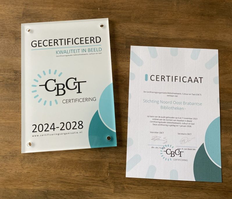 Meierijstad - De Noord Oost Brabantse Bibliotheken (NOBB) hebben opnieuw een officieel kwaliteitscertificaat ontvangen van de Certificeringsorganisatie Bibliotheekwerk, Cultuur en Taal (CBCT).