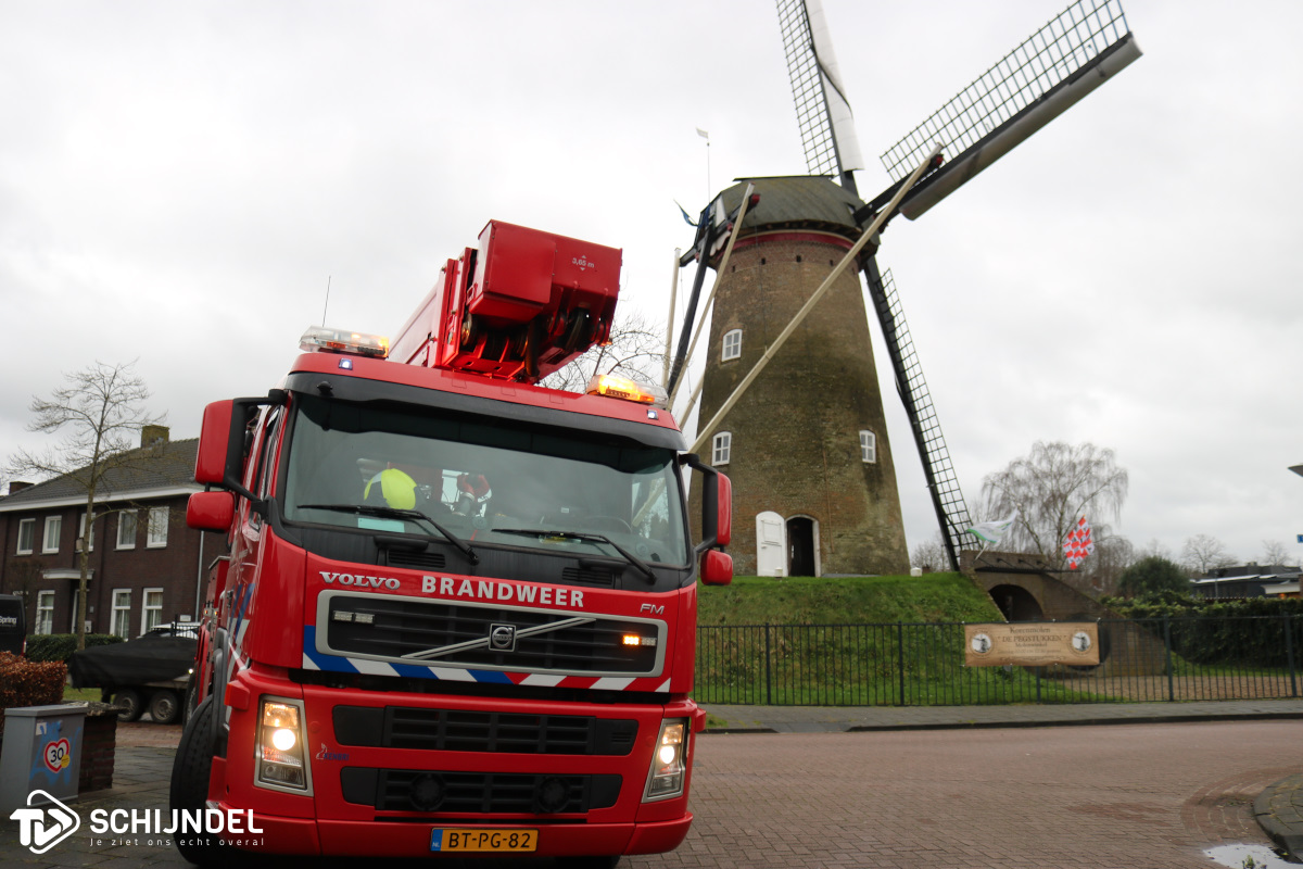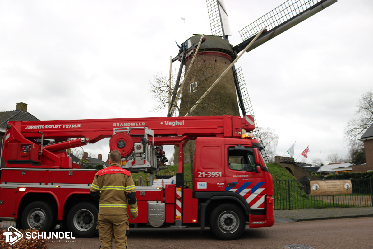 Schijndel - De brandweer van Veghel werd zaterdagochtend rond tien uur opgeroepen voor 'Dienstverlening' aan De Pegstukken. Bij de molen bleek een stuk van de dakbedekking losgewaaid te zijn. Beheerders ontdekten vanochtend de schade bij het openen van de molen. De hoogwerker van Veghel kwam ter plaatsen. De brandweerwagen bij de molen trok aardig wat bekijks van buurtbewoners.