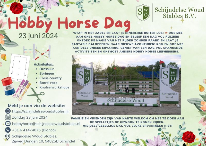 Kinderen die het spannend vinden worden door het zorgzame hobbyhorseteam op hun gemak gesteld en zullen waar nodig worden geholpen bij de verschillende rubrieken. Het draait allemaal om gezelligheid en samen met andere enthousiastelingen deze unieke sport beleven. Dus borstel je hobby horse en kom naar de Hobby Horse Dag in Schijndel. Meer informatie en veelgestelde vragen vind je op: Hobbyhorse – Schijndelse Woud Stables. Vragen? Mail naar Dit e-mailadres wordt beveiligd tegen spambots. JavaScript dient ingeschakeld te zijn om het te bekijken.of app/bel Bianca 0641474075