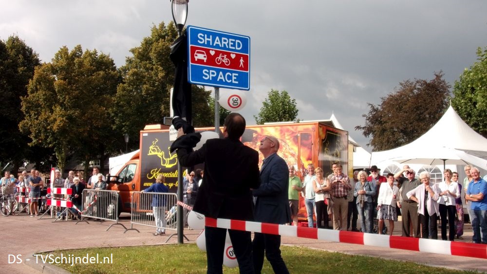 Schijndel - Het shared-space dorpsplein in Wijbosch is officieel geopend. Wethouder Bart Claassen onthulde samen met de voorzitter van de dorpsraad Frank Mulkens hét verkeersbord dat de shard-space in Wijbosch aangeeft. Rondom het plein zijn een viertal borden geplaatst. Kort voor deze handeling zorgde de harmonie voor het muzikale sfeertje en spraken de wethouder en Frank Mulkens alle aanwezigen toe. Daarin werd het voltallig aanwezige gemeentebestuur hartelijk bedankt voor de goede samenwerking de afgelopen periode. "Samen delen staat centraal net als samenwerken. Dat is ook nodig op dit plein én straks in Meierijstad", besloot de wethouder zijn woordje. De voorzitter van de dorpsraad haalde nogmaals aan dat het een 30 km zone is. "Daar moeten we met z'n allen aan werken. Want er word hard gereden door mensen van buiten het dorp maar ook door eigen bewoners". Na de officiële handeling was het tijd voor het feest. Er was gratis eten en drinken, een springkussen voor de kinderen en er was muziek van DJ's uit het dorp. Hieronder enkele foto's, in de video de beelden van de openingshandeling.