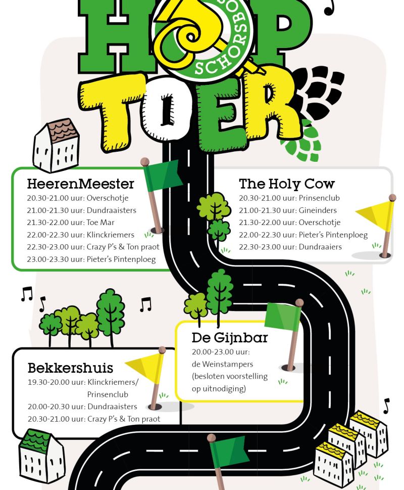 Schorsbos - Zaterdag 8 februari aanstaande is het weer zover, de Hoptoer. Vanaf 20.00 uur start die avond het programma en tot 23.30 uur zal er gratis genoten kunnen worden van band- en kapelmuziek, zang, dans, cabaret, tonpraat en speciale optredens die onder geen enkele noemer vallen. De avond begint met een carnavalesk programma voor de bewoners van het Bekkershuis, de rest van de avond kun je vrij binnenlopen bij de HeerenMeester, de Holy Cow, het Tramhuys, de Hopbel, de Sok, de Triangelbar en ’t Zuid en de Wedding Chapel van Net Nie. Ons advies is om overal even geweest te zijn. Op ons programma hebben we al aangegeven dat de Wijnbar dit jaar helaas niet mee kan doen. Veel spektakel was er vorig jaar bij slagerij van Rooij, waar Net Nie met een fantastische act voor één avond hun schla-la-la-gerij hebben gerund. We vertellen nog niet waar je deze creatieve club dit jaar tegen kunt komen, maar je mag er rustig vanuit gaan dat spektakel weer verzekerd is voor iedereen die zich op 8 februari van kroeg naar kroeg zal bewegen. De Hoptoer, iets aparts en een goeie reden om te veld te gaan. Voor het actuele programma zie Hoptoer.nl